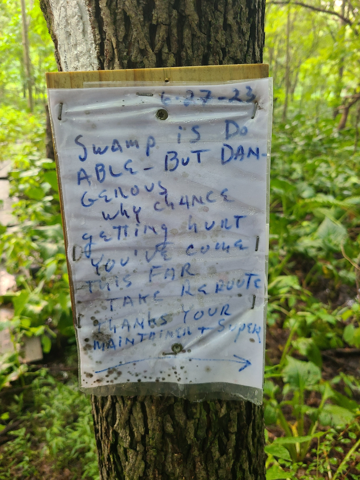 Going south I missed the alternate route sign to avoid walking the floating plank walkway through the swamp so I got wet, really wet. Jen did not miss the sign and she avoided it.